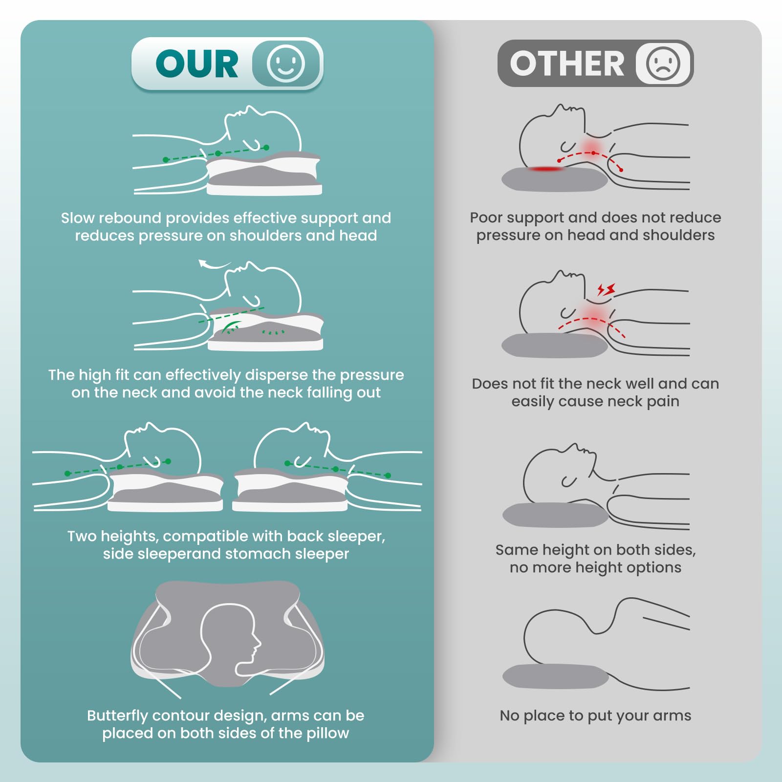 - 🌙【2 HEIGHTS AND ARMREST DESIGNS】 When you are still troubled about not finding the right height pillow, our cervical pillows have 2 different heights on both sides for you to choose, so you can choose the right one which is more suitable for your sleeping posture.
